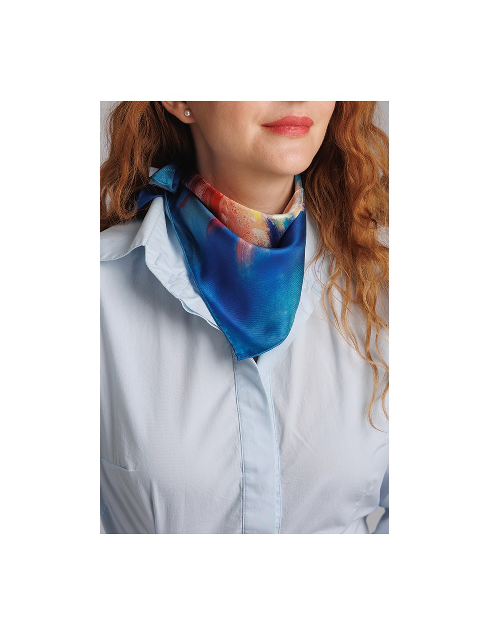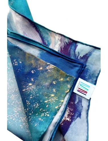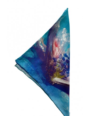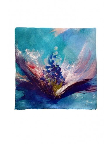 "Flowers Whispers" transforms the elegance of a painted canvas into the flowing grace of silk twill. Inspired by the original artwork, this scarf features expressive brush strokes of flower petals that seem to float effortlessly over a serene blue and turquoise background.
