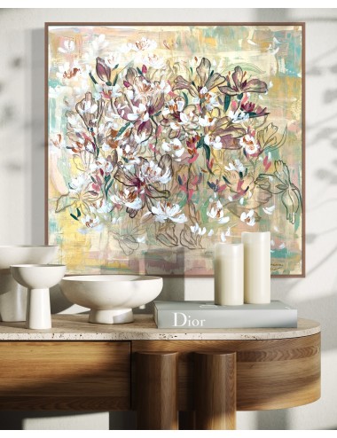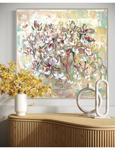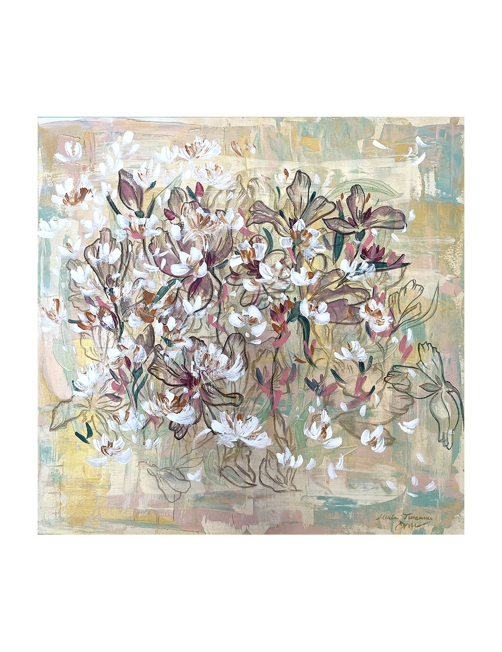 Over them, a translucent veil of gold brings the warmth of the setting sun, and above it, white flowers in motion — like a dream coming to life.