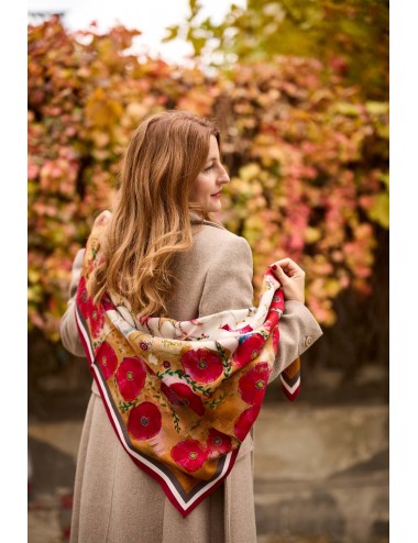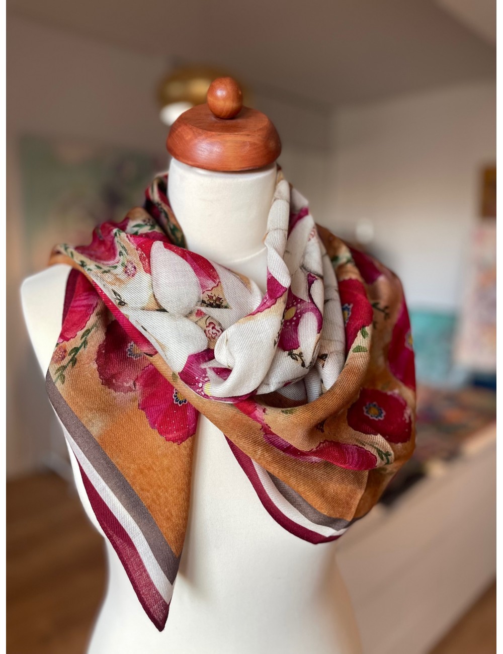 The soft, warm texture of pure wool enhances the scarf’s organic theme, making it a perfect companion for cool days. Its vivid contrasts of red and white create a dynamic yet elegant statement, blending nature’s beauty with timeless symbolism.