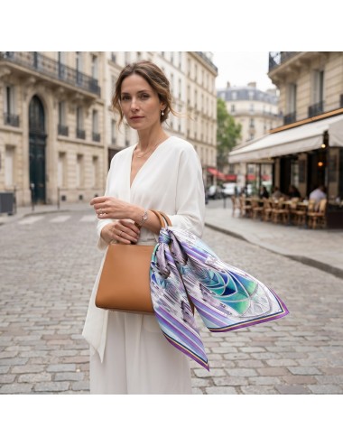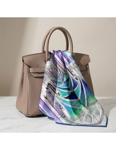 Vitraliile transformate în tușe de violet, turcoaz, albastru intens — toate dansează pe mătase precum lumina pe vitralii într-o după-amiază pariziană.
