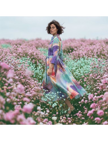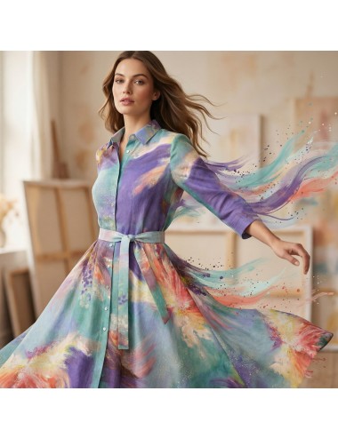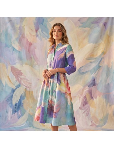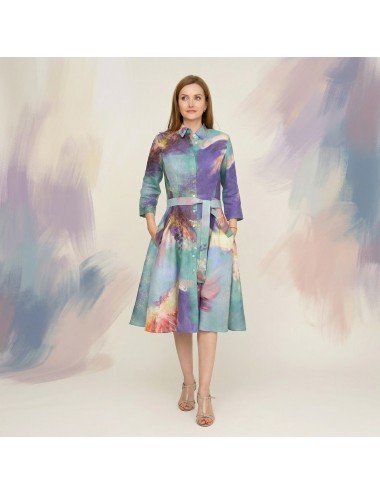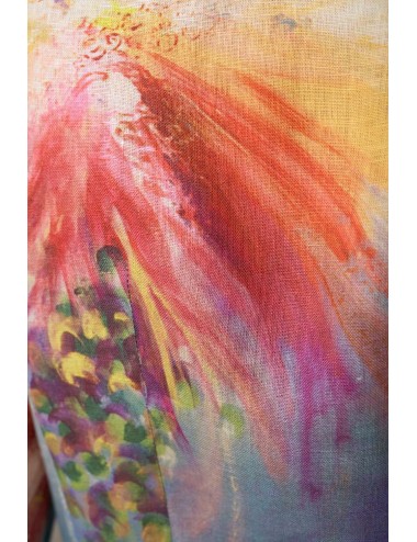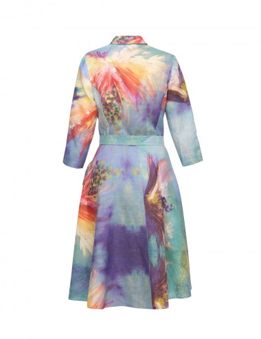 Rochie deosebita, imprimata cu pictura "Flowers Whispers", in tonuri vii de turcoaz, mov si indigo. O aditie valoroasa garderobei oricarei iubitoare de arta si calatorii.